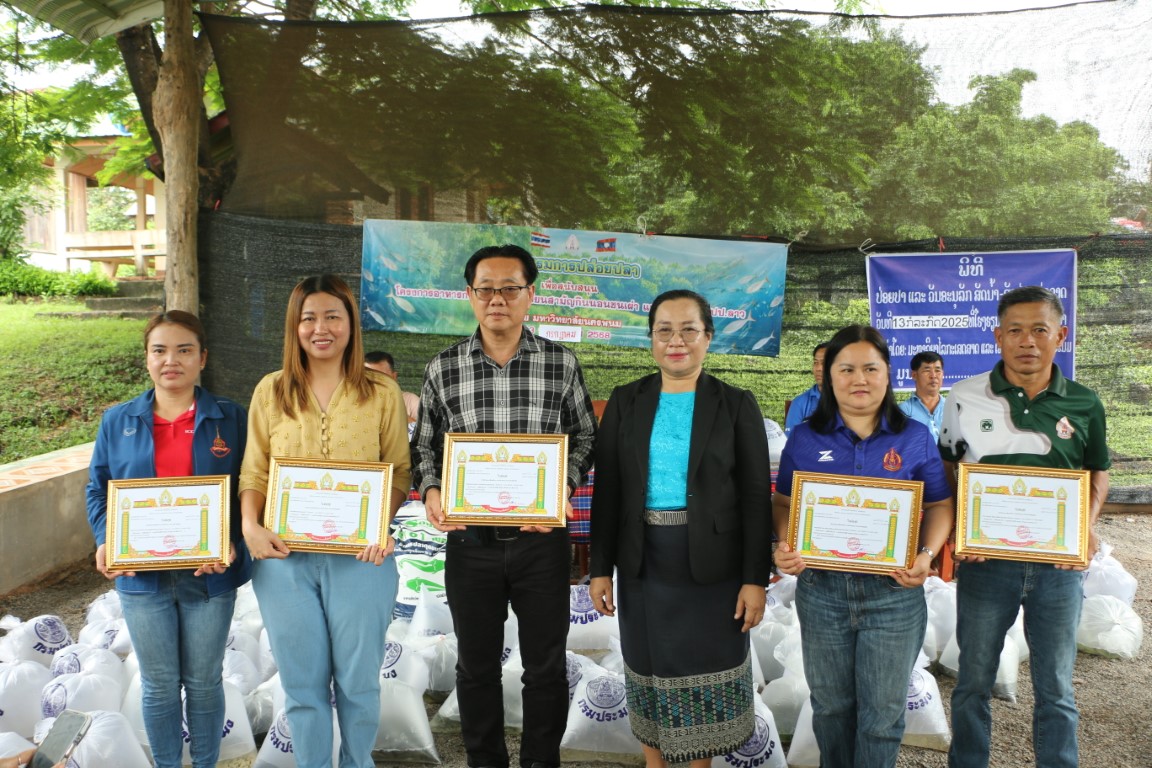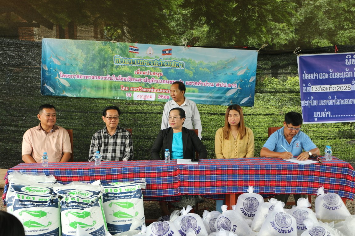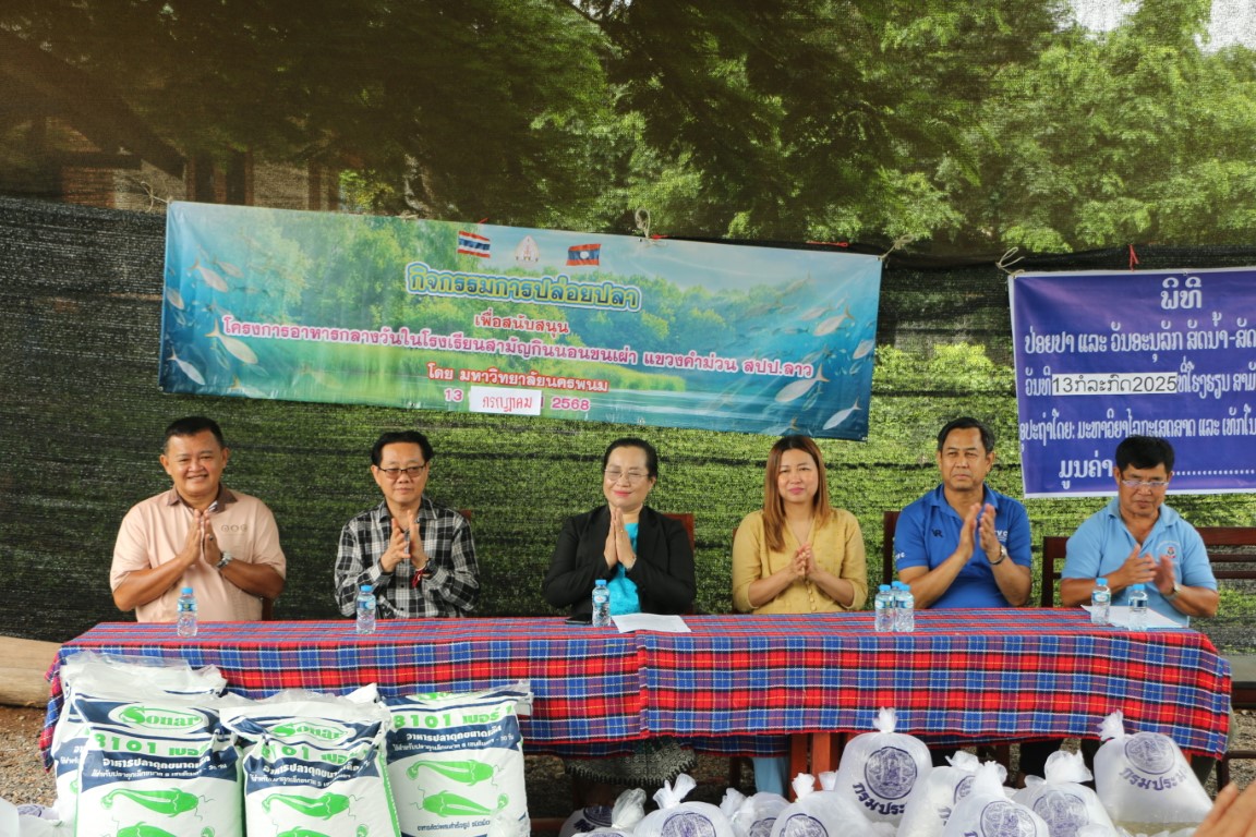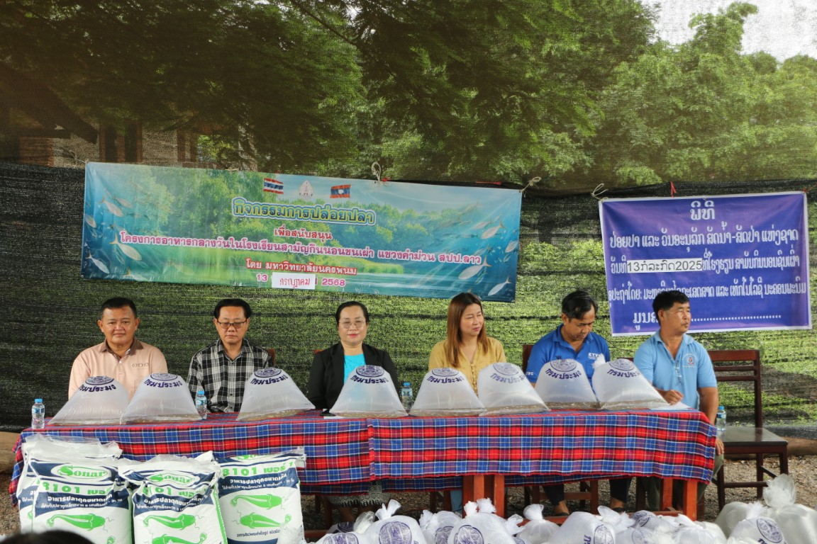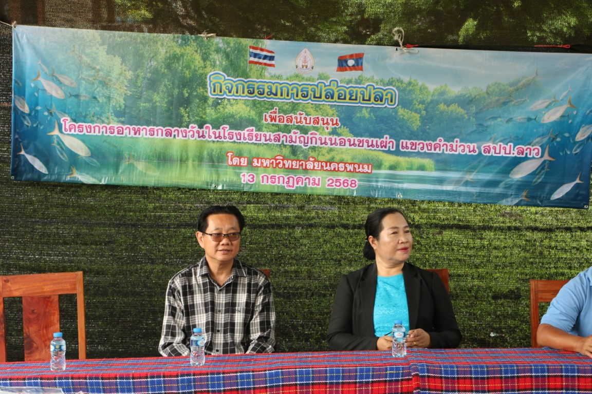 วันที่ 13 กรกฎาคม 2568 เวลา 09.00 น. ศาสตราจารย์เกียรติคุณ ดร.ธวัชชัย ศุภดิษฐ์ อธิการบดีมหาวิทยาลัยนครพนม พร้อมด้วยคณะผู้บริหารมหาวิทยาลัยนครพนม ผู้ช่วยศาสตราจารย์ ดร.เสาวคนธ์ เหมวงษ์ คณบดีคณะเกษตรและเทคโนโลยี คณาจารย์ และบุคลากร ร่วมกิจกรรมปล่อยปลาเนื่องใน วันปล่อยปลาแห่งชาติลาว ภายใต้โครงการเพิ่มศักยภาพการผลิตเกษตรแก่ศูนย์การเรียนรู้การเกษตรแนวเศรษฐกิจพอเพียง ณ โรงเรียนสามัญกินนอนชนเผ่า แขวงคำม่วน สาธารณรัฐประชาธิปไตยประชาชนลาว