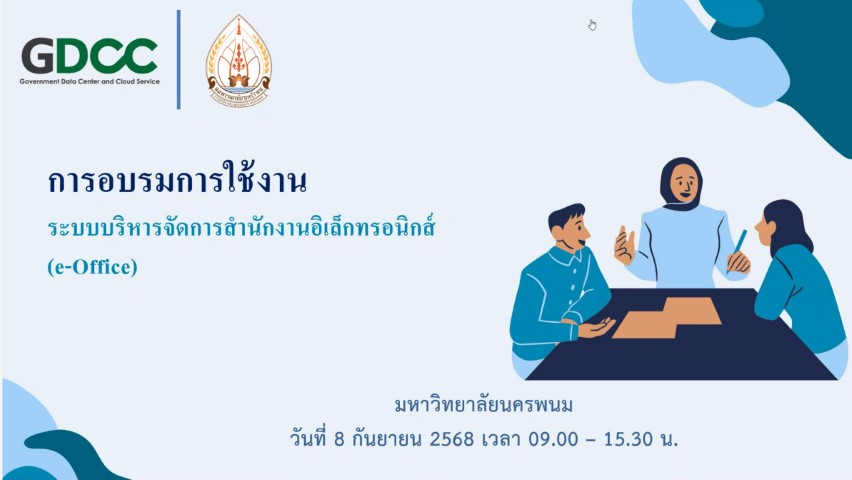 วันที่ 8 กันยายน 2568 เวลา 08.30 น. มหาวิทยาลัยนครพนม จัดโครงการอบรมการใช้งานระบบการจัดการสำนักงานอิเล็กทรอนิกส์ (e-Office) ภายใต้โครงการ Government Data Center and Cloud Service (GDCC) ในรูปแบบ Onsite และ Online โดยมี ศาสตราจารย์เกียรติคุณ ดร.ธวัชชัย ศุภดิษฐ์ อธิการบดีมหาวิทยาลัยนครพนม เป็นประธานกล่าวเปิดโครงการ พร้อมด้วย ผู้ช่วยศาสตราจารย์ ดร.ปรัชญา ธงพานิช ผู้ช่วยอธิการบดีฝ่ายสารสนเทศและการศึกษาสมัยใหม่ หัวหน้างานธุรการ และบุคลากรที่เกี่ยวข้องในสังกัดมหาวิทยาลัย เข้าร่วมประชุม ณ ห้องพนมพัฒน์ ชั้น 4 สำนักงานอธิการบดี มหาวิทยาลัยนครพนม เขตพื้นที่ศรีโคตรบูรณ์