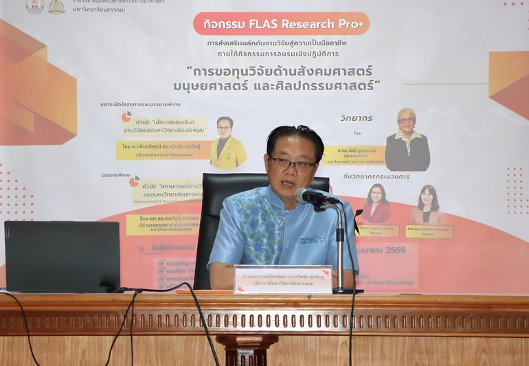 วันที่ 7 เมษายน 2569 เวลา 09.00 น. คณะศิลปศาสตร์และวิทยาศาสตร์ มหาวิทยาลัยนครพนม จัดกิจกรรม “FLAS Research Pro+ : การส่งเสริมผลักดันงานวิจัยสู่ความเป็นมืออาชีพ” ภายใต้การอบรมเชิงปฏิบัติการหัวข้อ “การขอทุนวิจัยด้านสังคมศาสตร์ มนุษยศาสตร์ และศิลปกรรม” เพื่อส่งเสริมและพัฒนาศักยภาพบุคลากรให้มีความรู้ ความเข้าใจด้านการวิจัยอย่างเป็นระบบ โดยมี ศาสตราจารย์เกียรติคุณ ดร.ธวัชชัย ศุภดิษฐ์ อธิการบดีมหาวิทยาลัยนครพนม เป็นประธาน พร้อมด้วย รองศาสตราจารย์ ดร.กรไชย พรลภัสรชกร รองอธิการบดีฝ่ายการคลัง วิจัยและบริการวิชาการ กล่าวต้อนรับ และผู้ช่วยศาสตราจารย์ ดร.ปุณณฑรีย์ เจียวิริยบุญญา คณบดีคณะศิลปศาสตร์และวิทยาศาสตร์ กล่าวรายงาน ณ ห้องพนมศิลป์ ชั้น M คณะศิลปศาสตร์และวิทยาศาสตร์ มหาวิทยาลัยนครพนม (เขตพื้นที่มรุกขนคร)